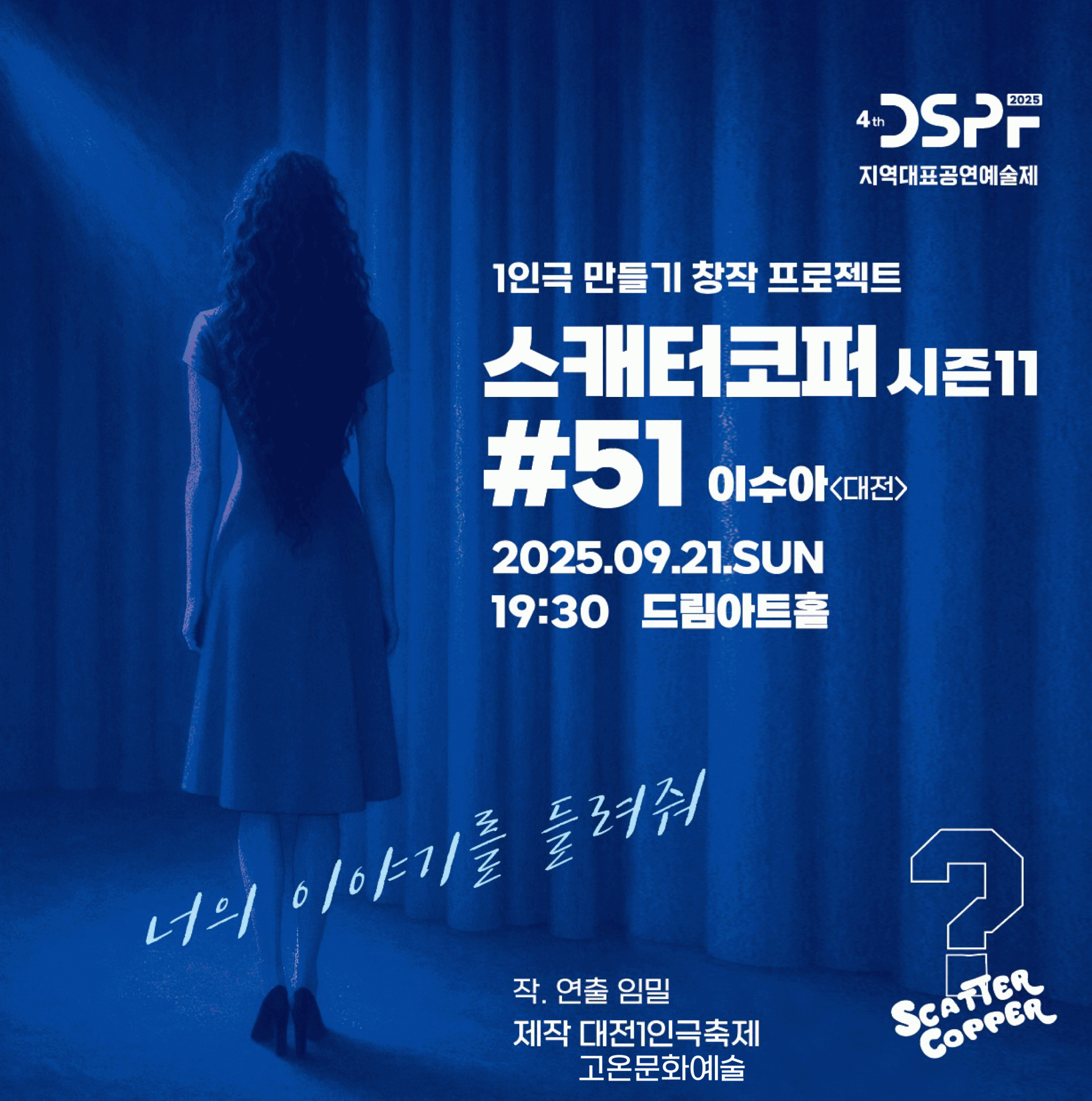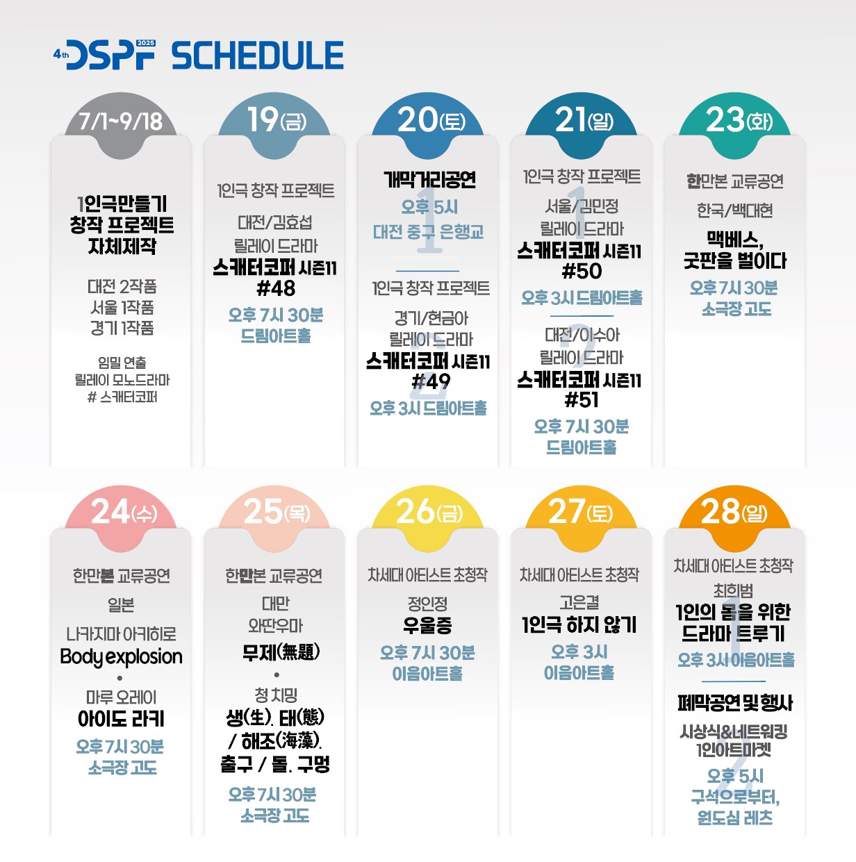 대전1인극축제는 국내 유일하게 1인, 1시간, 극장형 무대 퍼포먼스를 경험할 수 있는 특별한 기회를 제공합니다. 대전 지역을 비롯한 다양한 지역의 1인 아티스트들과 연출가 참여하는 ‘<1인극 만들기 프로젝트-스캐터코퍼 시즌11 #48~#51>’와 한국, 대만, 일본의 협업 작품인 ‘<한만본 프로젝트>’도 선보이며, 차세대 아티스트들의 신선하고 기발한 작품 등 총 10개의 극장 공연과 개,폐막 공연에서도 국내에서 활동하는 다양한 장르의 10명의 예술가들을 만나볼 수 있습니다.