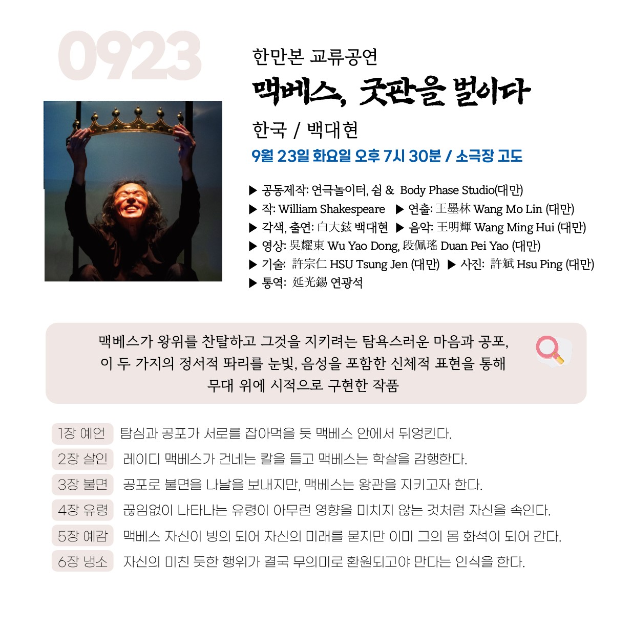 공연은 드림아트홀, 소극장 고도, 이음아트홀 등 여러 극장에서 진행되며, 개막공연은 대전 중구 은행교에서, 폐막공연과 다양한 행사들은 원도심레츠와 구석으로부터에서 펼쳐집니다. 이번 축제는 관객들이 일상 속에서 잠시 벗어나 예술과 치유의 시간을 경험하며, 새로운 영감과 평온을 찾는 소중한 기회가 될 것입니다.