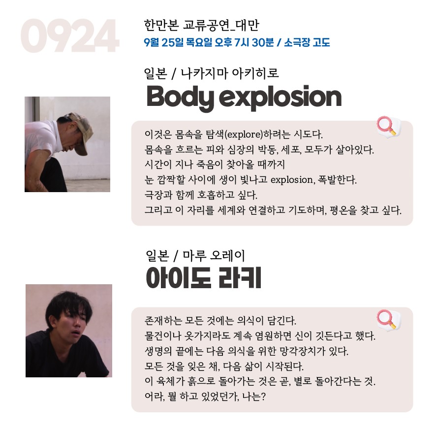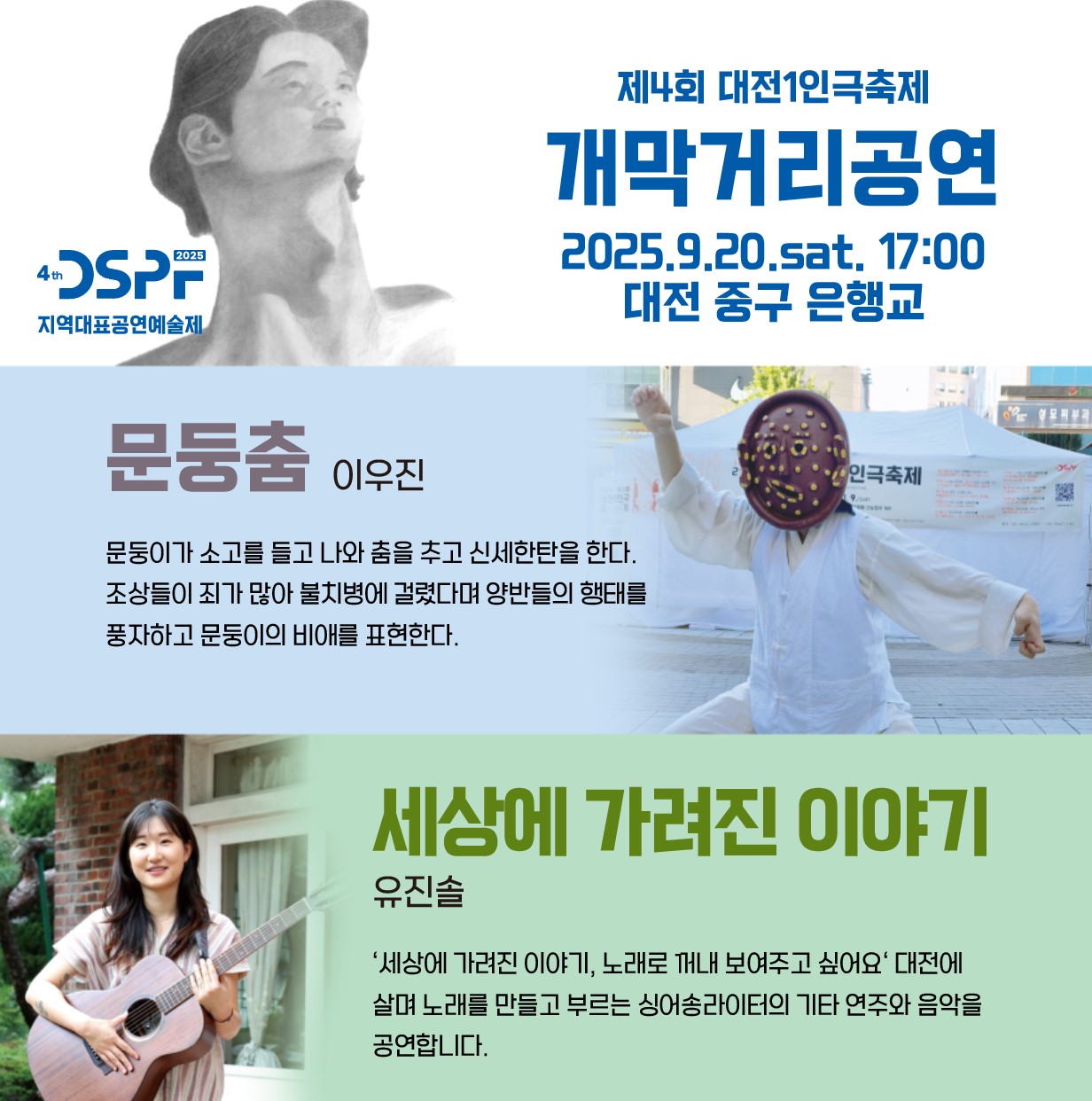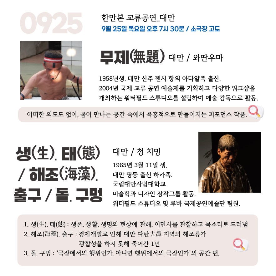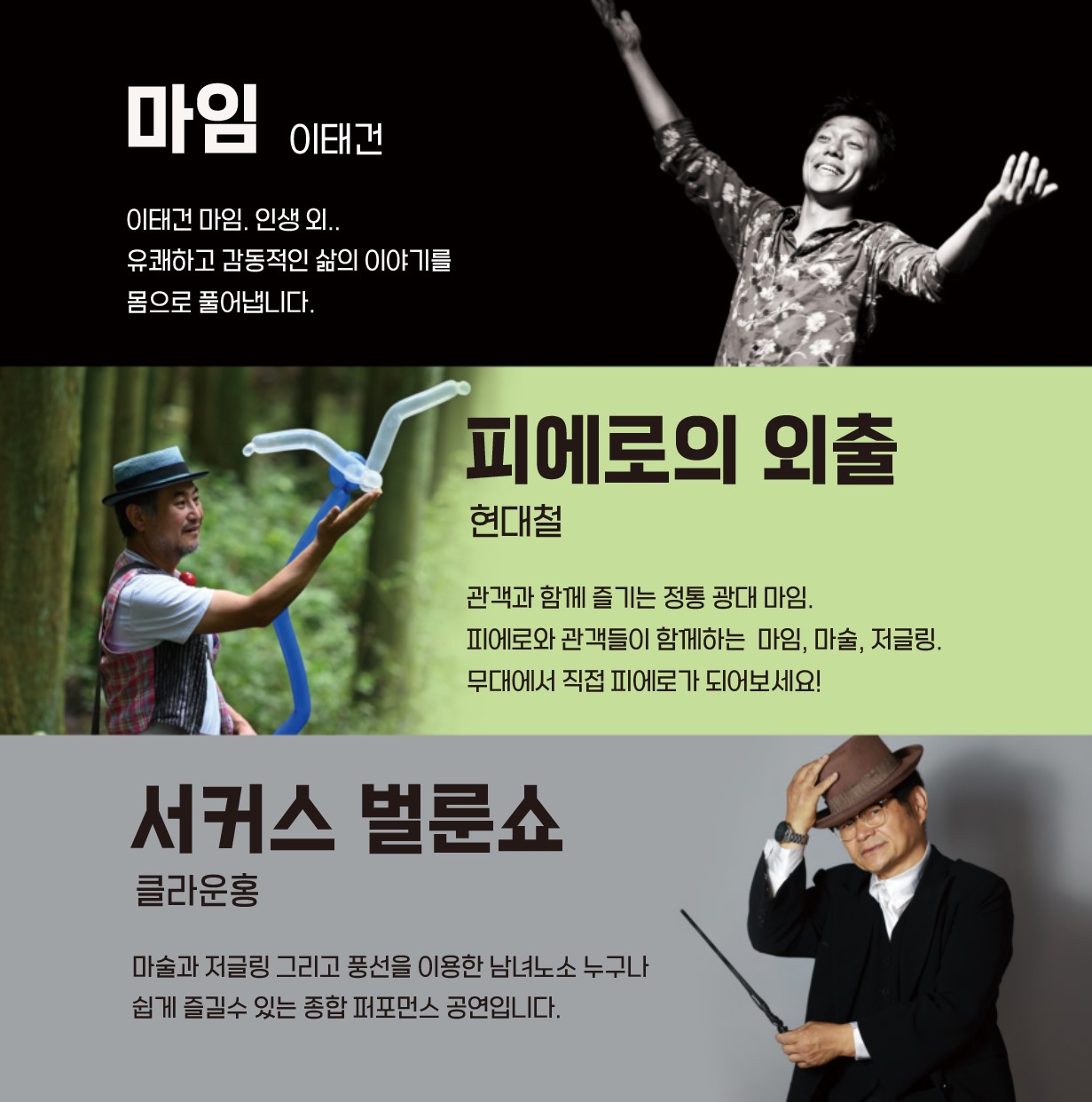 : 문둥춤-이우진 / 노래공연-유진솔 / 마임-이태건 / 광대놀이-현대철 /